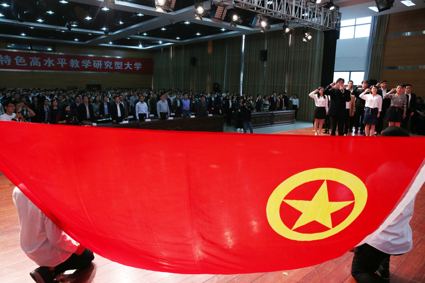 在最后一个篇章,校团委书记朱城带领全体团员重温入团誓词,齐唱《光荣啊!中国共青团》,带领他们用铿锵的誓言做出青春的承诺,激励通大青年不忘初心跟党走,喜迎十九大的胜利召开。