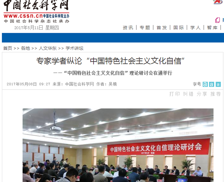 5月8日,中国社会科学网以《专家学者纵论“中国特色社会主义文化自信”——“中国特色社会主义文化自信”理论研讨会在通举行》为题,从加强文化自信的研究与建设、多举措提升中国特色社会主义文化自信两个维度对研讨会进行深度报道。