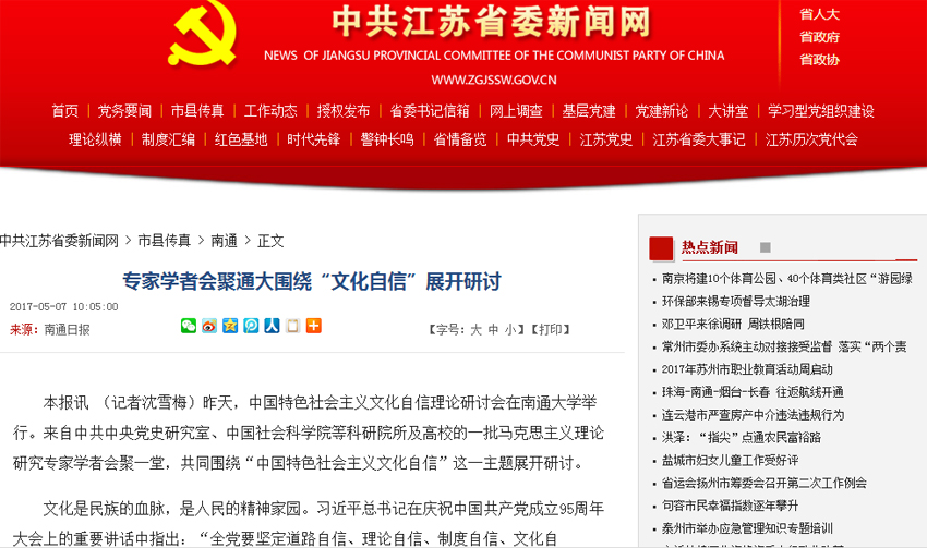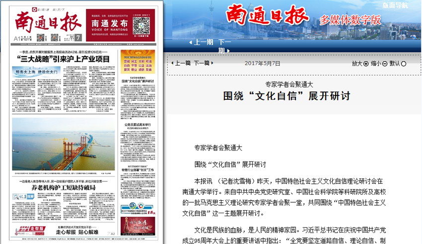 当晚,新华网发布题为《“文化自信研讨会”在南通大学举行》的报道。5月7日,《南通日报》在头版刊发题为《专家学者会聚通大围绕“文化自信”展开研讨》的报道,并被中共江苏省委新闻网全文转载。