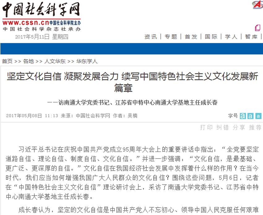 同日,中国社会科学网发布对我校党委书记、中特基地主任成长春教授的专访报道。文章以《坚定文化自信凝聚发展合力续写中国特色社会主义文化发展新篇章》为题,围绕文化自信在我国经济社会发展中发挥着什么样的作用及当今时代,应当如何增强我国广大人民群众的文化自信等问题,对成长春进行了专访。成长春认为,坚定的文化自信是中国共产党人不忘初心、领导中国人民克服任何艰难险阻奋勇前进的精神支柱,文化自信是增强民族凝聚力和创造力的基础,要在历史学习和比较互鉴中增强文化自信。