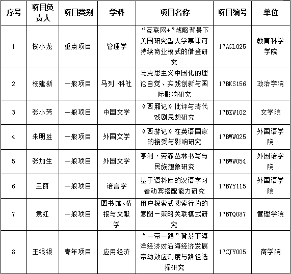 又讯 日前,全国哲学社会科学规划办公室公布2017年度国家社科基金项目评审结果,我校获得8项。其中,外国语学院获得一般项目3项,教育科学学院获得重点项目1项。