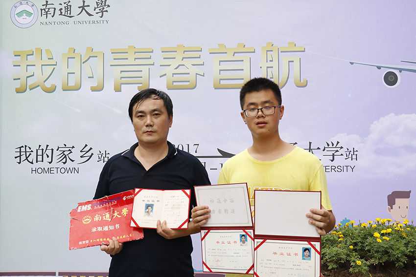 机械工程学院新生葛剑波来自南通通州的“通大之家”。报到当天,他随身带着一张父亲的毕业证书,引起了现场师生的关注。葛剑波的父亲王葛军在1995年考入原南通师专,读的是体育专业。“爸爸是我的榜样!”提起父亲,葛剑波很是骄傲。无巧不成书,葛剑波的堂爷爷秦亦强曾在原南通师专物理系工作,他的舅舅张新华、舅妈任银霞也曾就读于通大。来学校前,作为“老学长”的舅舅给了葛剑波很多建议,“少玩游戏、好好学习、打好基础,跟室友、同学也要处好关系。”作为一家中的第三代通大人,葛剑波心里有一种说不出的奇妙感,“能在家乡上大学是一件美好的事情,这真的是一种难得的缘分。”尽管已不是第一次走进通大校园,但葛剑波依旧很兴奋,他的父亲王葛军也感慨道:“主校区变化很大,更新、更漂亮了。”站在主校区图书馆前,葛剑波雄心勃勃地为自己立下了一个目标:“我一定会好好学习,读完本科后继续深造研究生,在通大书写自己的故事!”
