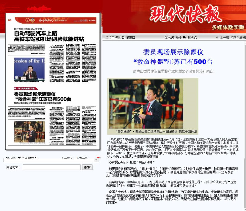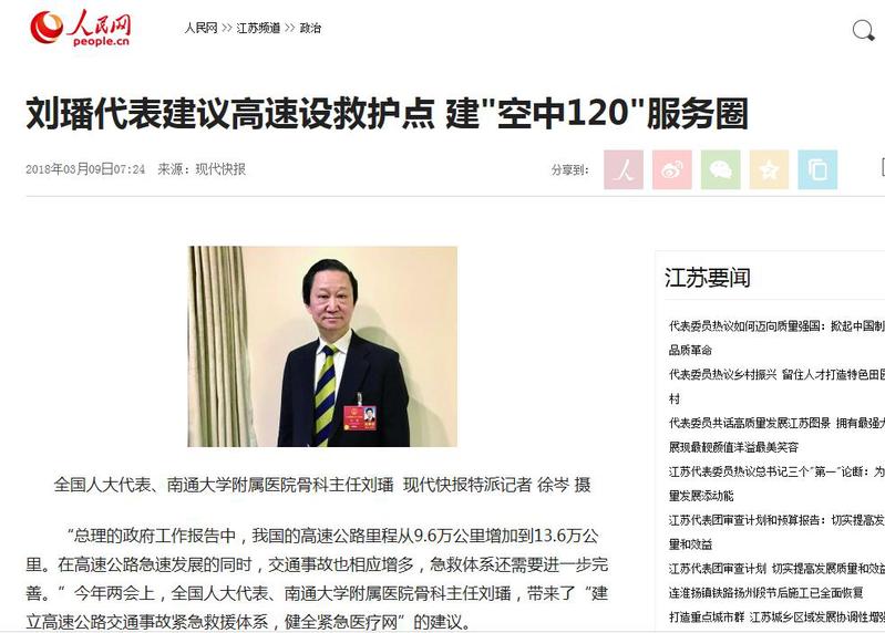 3月9日、11日出版的现代快报在《奋斗新时代·聚焦全国两会》专版刊发刘璠建议设立高速救护点,建“空中120”服务圈,并且普及公众的急救知识的建言。