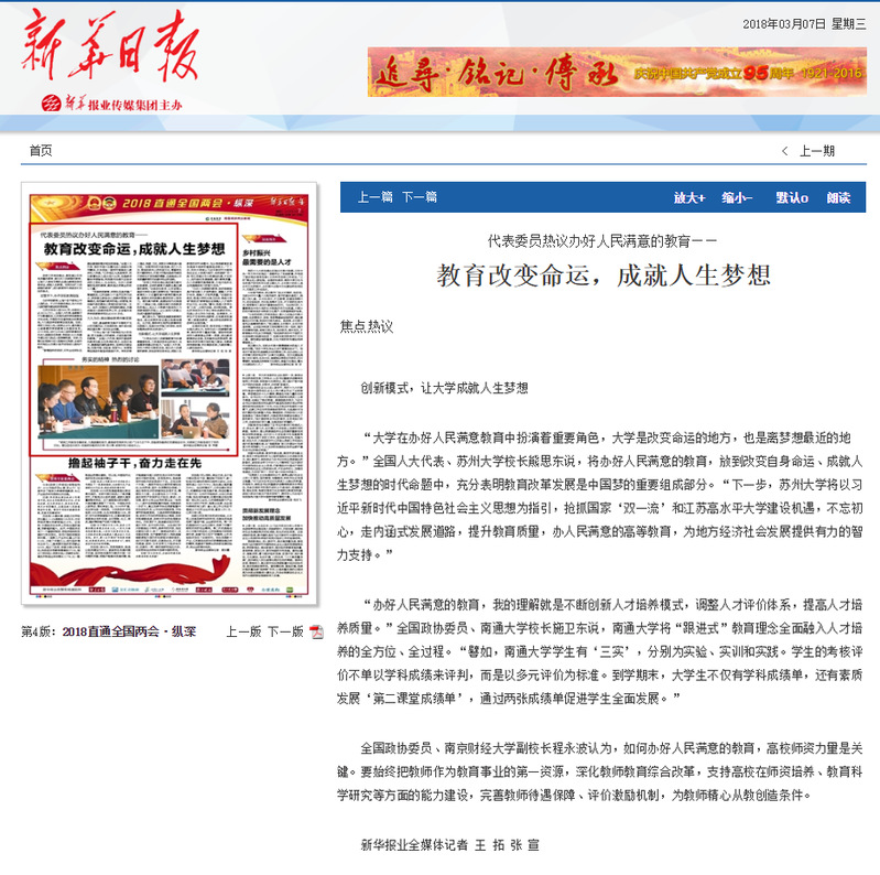 3月12日出版的新华日报在《2018直通全国两会·聚焦》专版刊发了施卫东建议要多措并举促进高校毕业生充分就业的建言。