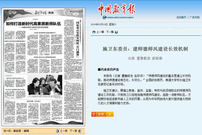 3月10日出版的中国教育报在三版以《施卫东委员:建师德师风建设长效机制》为题,刊发了施卫东建议要建立教育、宣传、监督、考核与奖惩相结合的师德师风建设工作机制的建言。