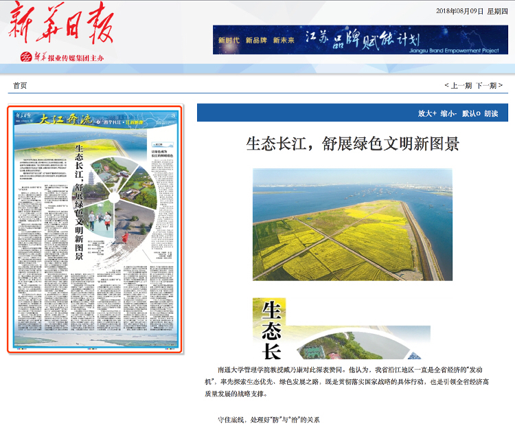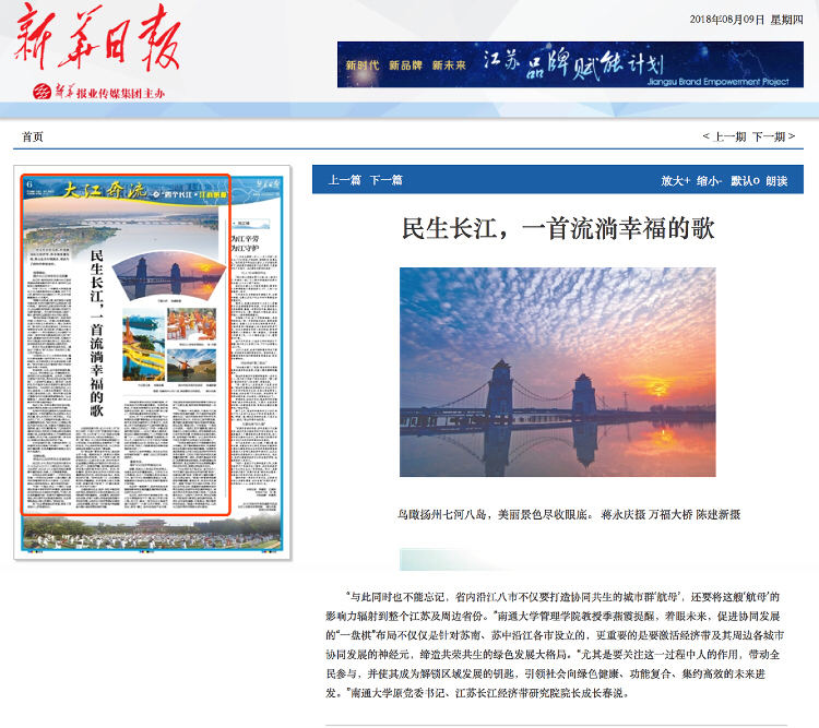 8月9日出版的《新华日报》分别在第3版和第6版以《生态长江,舒展绿色文明新图景》和《民生长江,一首流淌幸福的歌》为题,就长江经济带发展问题采访我校管理学院臧乃康、季燕霞教授。臧乃康认为,我省沿江地区一直是全省经济的“发动机”,率先探索生态优先、绿色发展之路,既是贯彻落实国家战略的具体行动,也是引领全省经济高质量发展的战略支撑。季燕霞认为,着眼未来,促进协同发展的“一盘棋”布局不仅仅是针对苏南、苏中沿江各市设立的,更重要的是要激活经济带及其周边各城市协同发展的神经元,缔造共荣共生的绿色发展大格局。