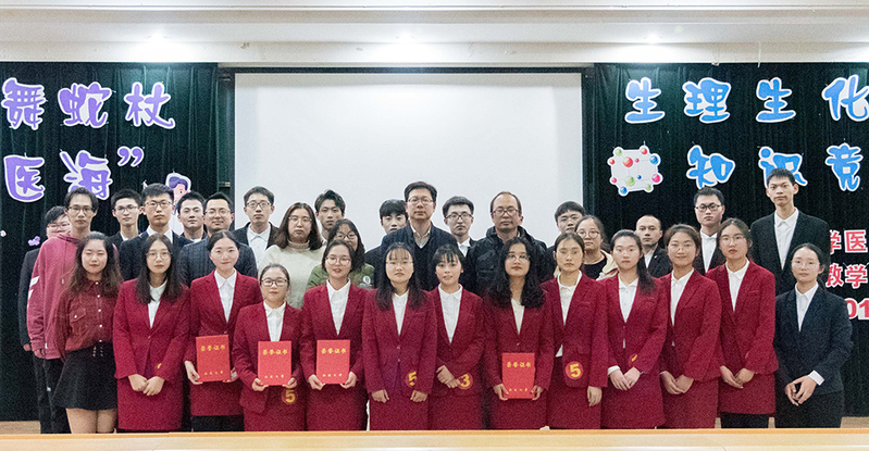 12月7日晚,由校教务处主办、医学院承办的 “齐舞蛇杖,共渡医海”生理生化知识竞赛决赛在启秀校区举行。经过激烈的比拼,临床173徐光明同学团队荣获一等奖,临床1710高涵琛同学团队、临床174陶新宇同学团队荣获二等奖,临床1710夏清泉同学团队、临床178班张榜同学团队、临床1710苏成凡同学团队荣获三等奖。医学院党委副书记、副院长宋建为获奖同学们颁奖。