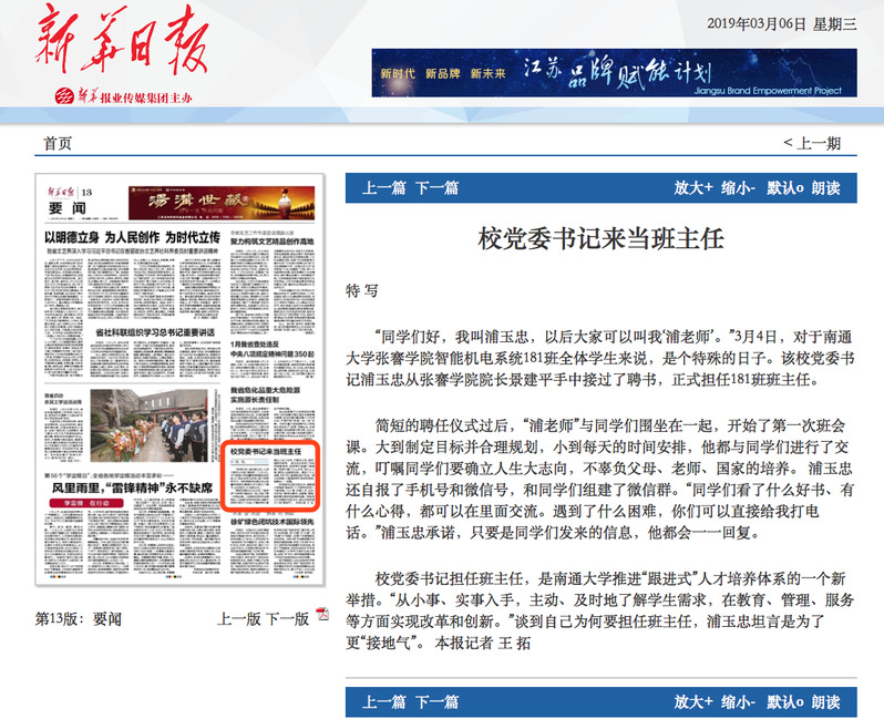 3月6日出版的《新华日报》在要闻版以《校党委书记来当班主任》为题,报道了我校创新举措,推进“跟进式”人才培养体系,校党委书记浦玉忠担任张謇学院智能机电系统181班班主任,与学生零距离交流。