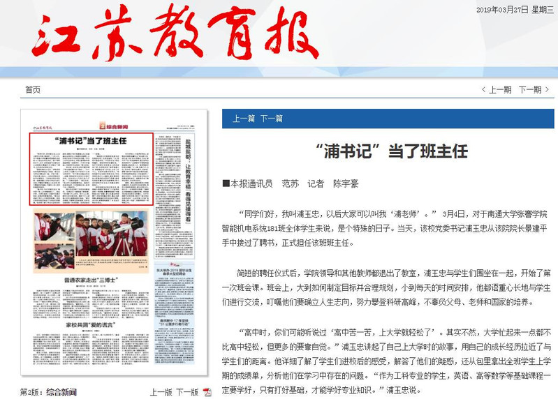 3月27日出版的《江苏教育报》在2版头条位置刊发题为《“浦书记”当了班主任》的深度通讯,报道校党委书记浦玉忠担任张謇学院智能机电系统181班班主任,推进“跟进式”人才培养体系。