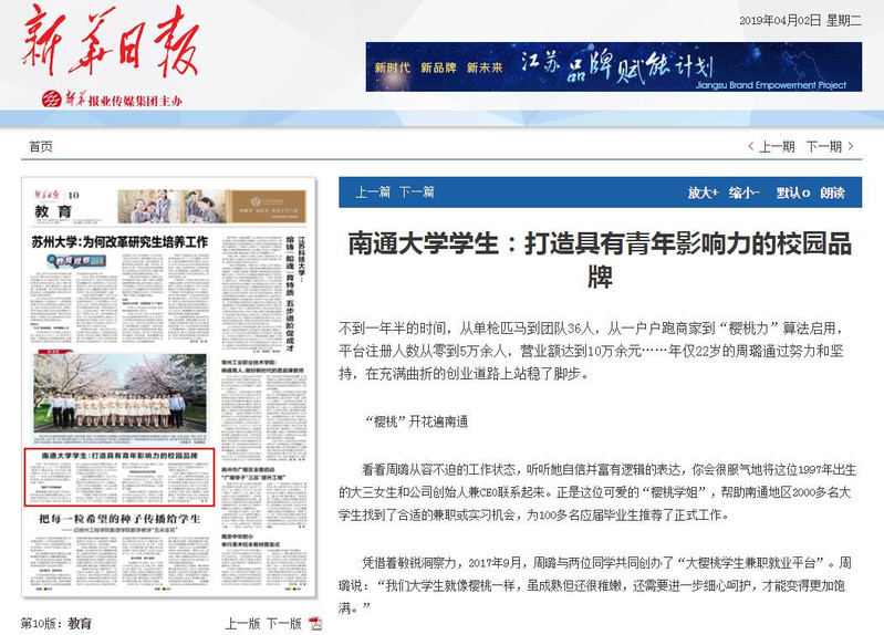 4月2日出版的《新华日报》在教育版以《南通大学学生:打造具有青年影响力的校园品牌》为题,关注我校大三学生周璐的创业故事。