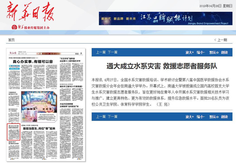 4月28日出版的《新华日报》在综合版以《通大成立水系灾害救援志愿者服务队》为题,报道了我校成立国内高校首支大学生水系灾害救援志愿者服务队。