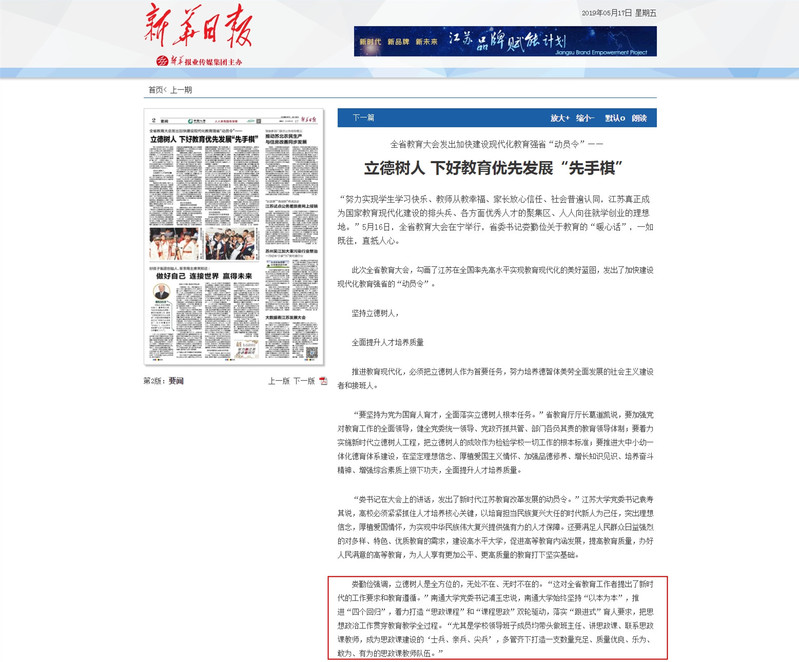 5月17日,《新华日报》在2版头条位置刊发题为《全省教育大会发出加快建设现代化教育强省“动员令”——立德树人 下好教育优先发展“先手棋”》的通讯报道,校党委书记浦玉忠接受记者采访,畅谈对全省教育大会精神的感悟。