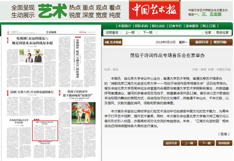 5月20日,《中国艺术报》在第4版以《范伯子诗词作品专场音乐会在京举办》为题报道我校艺术学院主办的“诗韵流芳江海文化走进北京大学——范伯子诗词作品专场音乐会”。