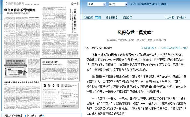 2019年7月12日21点22分,汤淳渊同志因病去世,享年83岁。他是全国精神文明建设典型“莫文隋”的主要原型,我校退休教师,原南通工学院党委委员、副院长,“感动南通•教育人物”特别荣誉奖获得者,江苏高教30年重要影响人物提名者。南通市委书记陆志鹏批示强调,“莫文隋”精神是南通“凡人善举”的生动实例,是“精神文明南通现象”的突出标志,号召全市大力弘扬“莫文隋”精神,为建设“强富美高”新南通提供坚强精神动力和道德支撑。