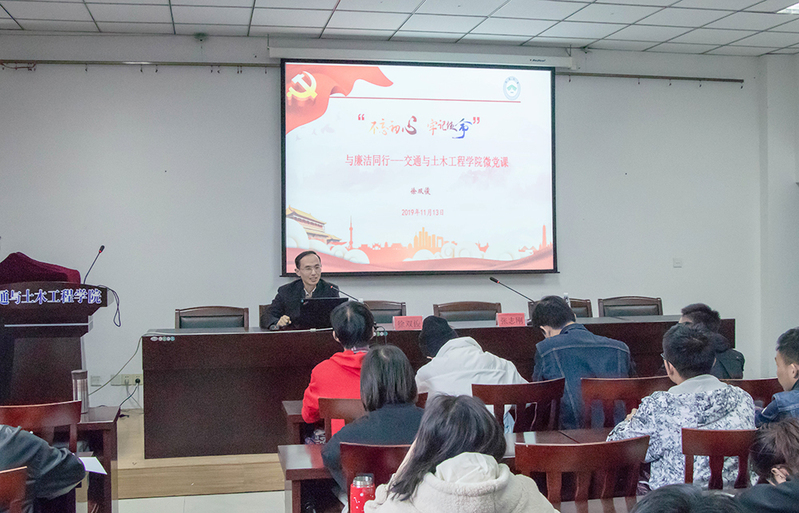 11月13日下午,交通与土木工程学院分党校举办专题党课。校纪委副书记兼纪委(监察专员办)办公室主任徐双俊应邀为学院师生作题为《与廉洁同行》的专题讲座。学院党委副书记、副院长张志刚主持党课。
