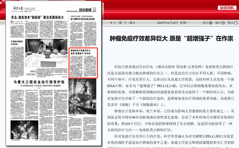 12月16日出版的《科技日报》在第3版以《肿瘤免疫疗效差异巨大 原是“超增强子”在作祟》为题,刊发我校范义辉教授课题组和毛仁芳教授课题组科研新成果。