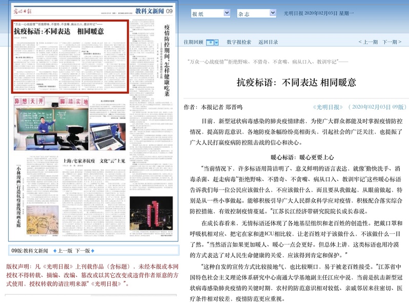 2月3日,《光明日报》第9版刊发题为《抗疫标语:不同表达 相同暖意》的文章,江苏省中特中心南通大学基地主任成长春、副主任江应中接受采访,畅谈对当前抗疫标语的观点。