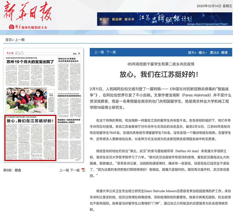 2月14日出版的《新华日报》在第9版以《放心,我们在江苏挺好的!》为题,聚焦我校留学生疫情防控工作。交汇点进行了相关报道。
