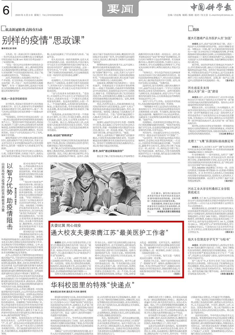 3月3日,《中国科学报》在第六版以《夫妻比翼 同心战疫 通大校友夫妻荣膺江苏“最美医护工作者”》为题,报道我校公共卫生学院2013届毕业生浦浙宁、李心意夫妇共同抗疫的故事。