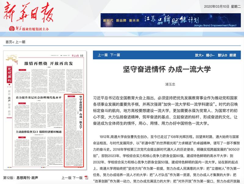 3月10日,《新华日报》在思想周刊版面刊发我校党委书记浦玉忠题为《坚守奋进情怀 办成一流大学》的署名文章。