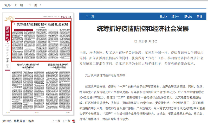 3月10日,《新华日报》智库版刊发成长春教授等专家撰写的理论文章《统筹抓好疫情防控和经济社会发展》。此外,2020年第4期《群众》杂志刊发刘峻源博士等专家撰写的决策咨询报告《健康与防疫相融合,提升城市治理能力》。两篇研究成果还被学习强国平台全文转载。