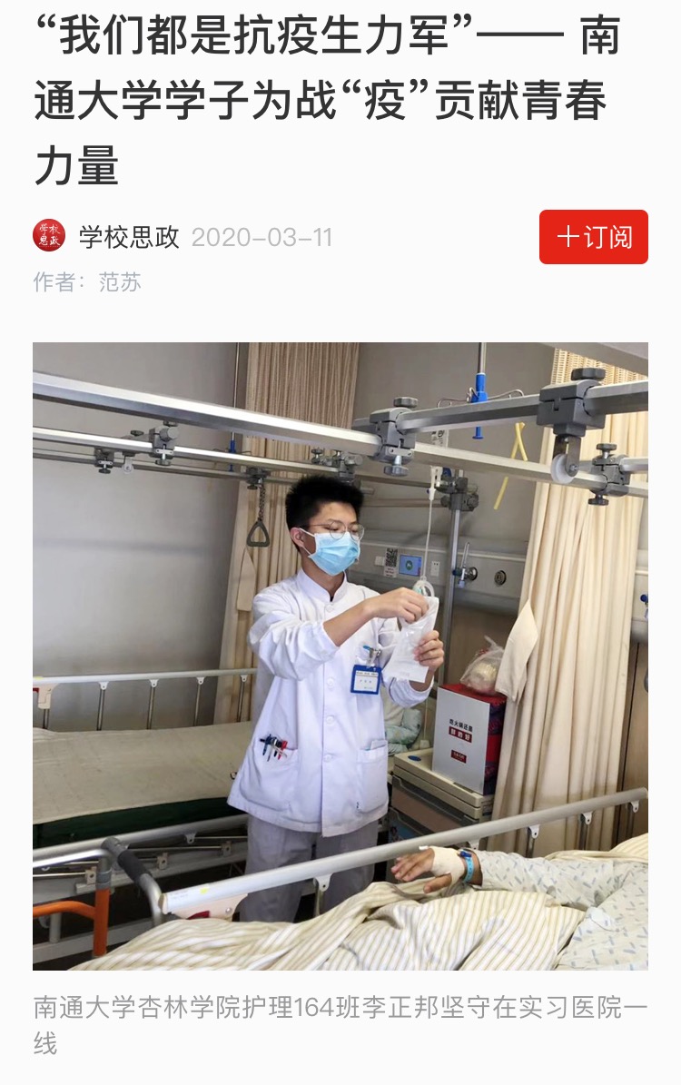 3月11日,“学习强国”平台以《“我们都是抗疫生力军”—— 南通大学学子为战“疫”贡献青春力量》为题,关注我校学子参与战“疫”。