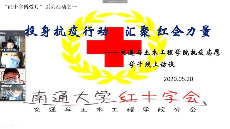 5月20日,交通与土木工程学院红十字分会利用腾讯会议平台,举办以“投身抗疫活动 汇聚红会力量”为主题的抗疫志愿学子线上访谈直播活动。