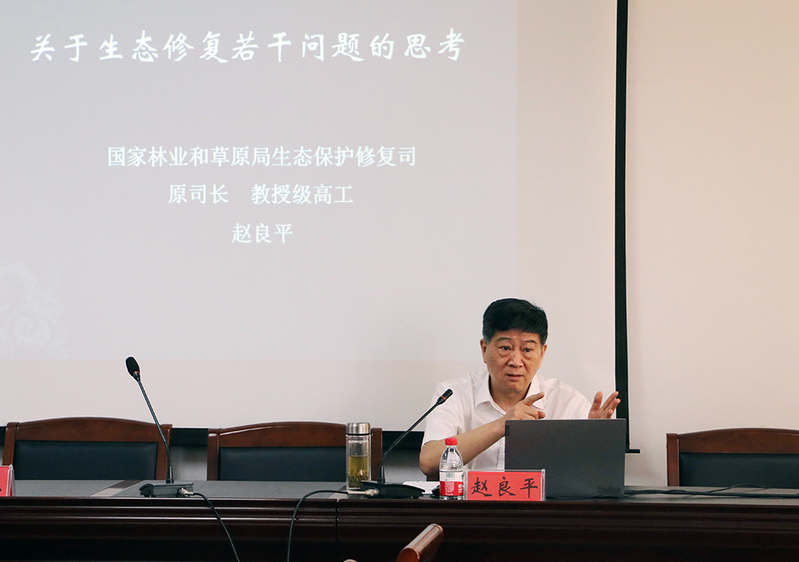 赵良平为学院师生做了题为《关于生态保护修复若干问题的思考》的专题报告。他结合多年担任国家林业和草原局生态保护修复司司长的工作经验,与师生共享了国家生态治理要求、生态系统修复与水资源利用、植被品种的本地化和多样化以及人类生态健康等方面的理论知识,并提出师法自然、城乡差别化个性化等科学生态观点。