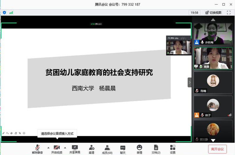 学前儿童发展与教育研究所开展第五期线上学术研讨活动。本次活动由学院副院长、研究所所长许铁梅主持,邀请了来自西南大学、吉林师范大学等三位学前教育专业博士做学术报告。西南大学杨晨晨围绕《贫困幼儿家庭教育的社会支持研究》进行了分享,界定了不同取向的贫困观贫困幼儿的含义,展示了访谈数据并分析了贫困幼儿家庭教育社会支持的现实境况,并从微观和宏观两个层面探讨了贫困幼儿家庭教育社会支持的实践路径。吉林师范大学时松做了题为《学前专业大学生边境乡村幼儿园从教意愿及影响因素研究——以云南高校为例》的研究报告,他分析了边境乡村幼儿园师资建设的现状和问题,在此基础上提出了三点思考,并针对如何解决边境乡村幼儿园师资建设问题提出了自己的建议。吉林师范大学凌晓俊以《大学生文化资本、挫折容忍力与幸福感关系研究——以学前教育专业为例》为题,介绍了研究的动机和目的,并界定了文化资本、挫折容忍力和幸福感这三个主要概念,展示了运用问卷调查和访谈法得出的研究结果,通过分析数据总结针对家庭、学校以及大学生个人的建议。