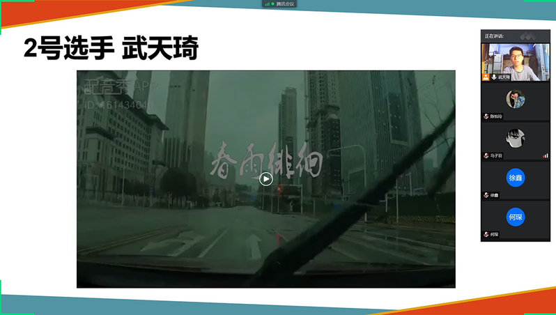 本次大赛涌现出一批情感真挚、动人心弦的优秀作品。人文地理规划181马子羽的《We are all fighters》表达了对一线抗疫人员的无比崇敬之情以及对抗疫必胜的坚定信心;地理信息182武天琦通过一首小诗《春雨徘徊》抒发了春雨一样润物无声的情感,让人们对疫情中的医患之情久久回味;人文地理规划182何琛以全国性哀悼活动为主题缅怀逝者,致敬英雄;环境科学191文泽景以“背影”为关键词,深深道出了自己对最美“逆行者”的景仰崇敬;地理师范181吴淑婷的《中国阻击战》,透露出“我们终将赢来春回大地,播撒芬芳勃发生命,到那时,久闭的家门一定会被春风敲开”的美好期许;地理师范181刘荣琳的影视剧片段配音则展现了广大医护工作者的伟大崇高,令人动容。