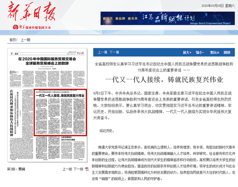 9月5日,《新华日报》在2版刊发题为《全省高校师生认真学习习近平总书记在纪念中国人民抗日战争暨世界反法西斯战争胜利75周年座谈会上的重要讲话 ——一代又一代人接续,铸就民族复兴伟业》的报道,我校党委书记浦玉忠就如何在大学生中传承弘扬抗战精神接受记者采访。