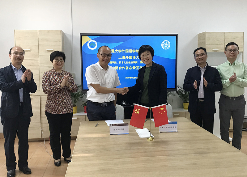 10月10日,外国语学院院长陆国君、学院党委书记朱小娟一行赴上海外国语大学签署全面合作协议,陆国君代表学院分别与上海外国语大学英语学院、国际教育学院、日本文化经济学院领导共同签署合作备忘录。