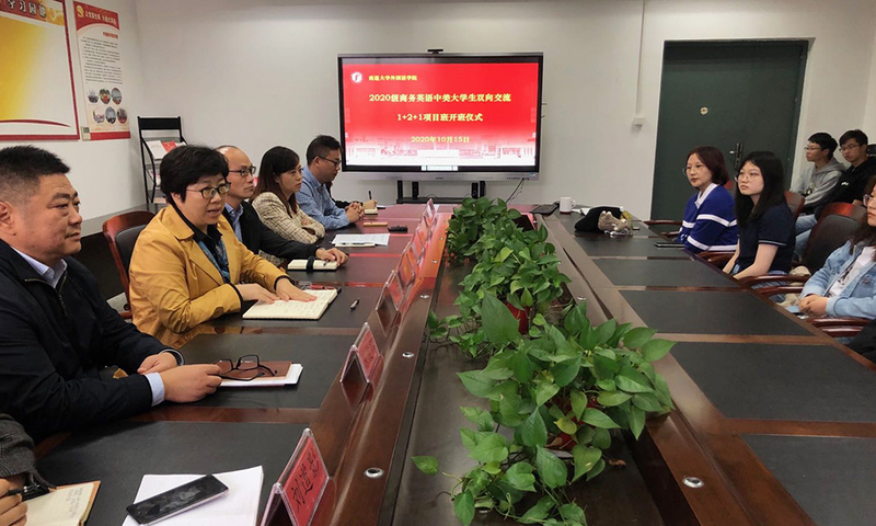 10月15日下午,外国语学院举行2020级商务英语专业中美双向交流1+2+1项目班开班仪式。
