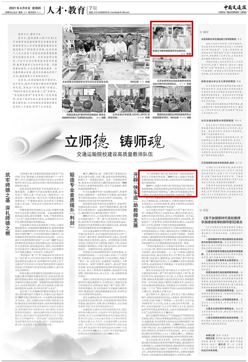 4月8日出版的《中国交通报》以《立师德 铸师魂》为题介绍交通运输院校建设高质量教师队伍情况,其中关注了我校师资建设成效。