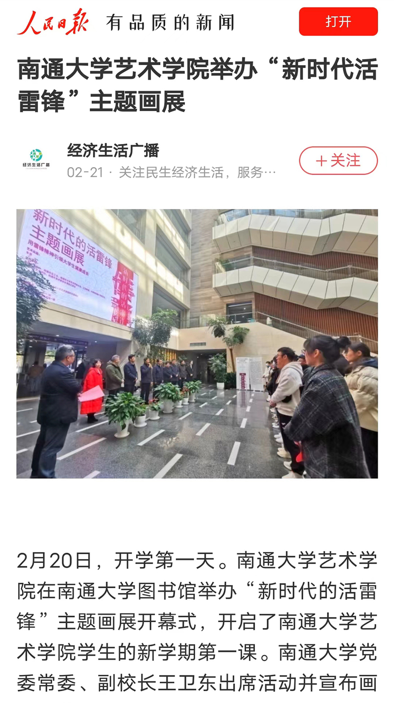 2月20日,由南通市文明办、南通大学艺术学院、南通市美术家协会漫画艺委会等单位共同主办的“新时代的活雷锋”主题画展在南通大学图书馆开幕,开启了南通大学艺术学院新学期第一堂思政课。人民日报APP、新华网、光明日报APP、中国日报网、中国美术报公众号、紫牛新闻等媒体平台纷纷关注,并进行相关报道。