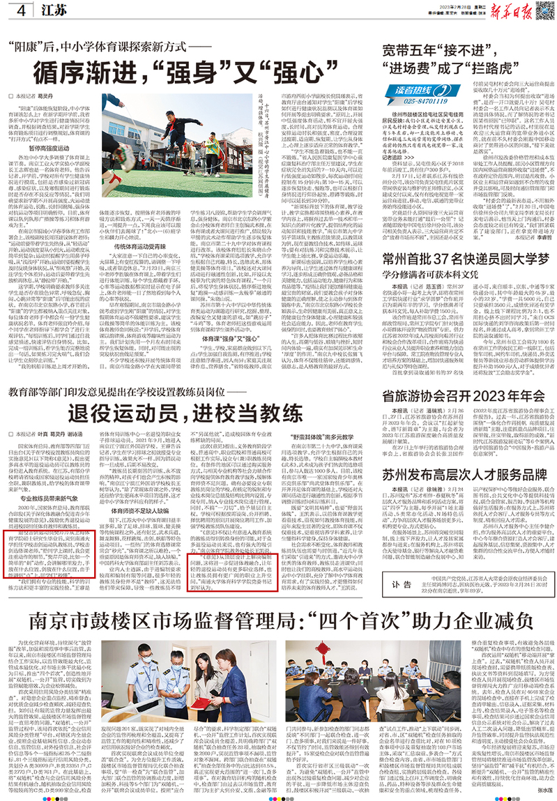2月28日出版的《新华日报》以《退役运动员,进校当教练》为题,围绕深化体教融合、在学校设置教练员岗位等问题采访我校体育科学学院党委书记刘军和击剑运动队教练员、击剑选修课老师樊芹芹。