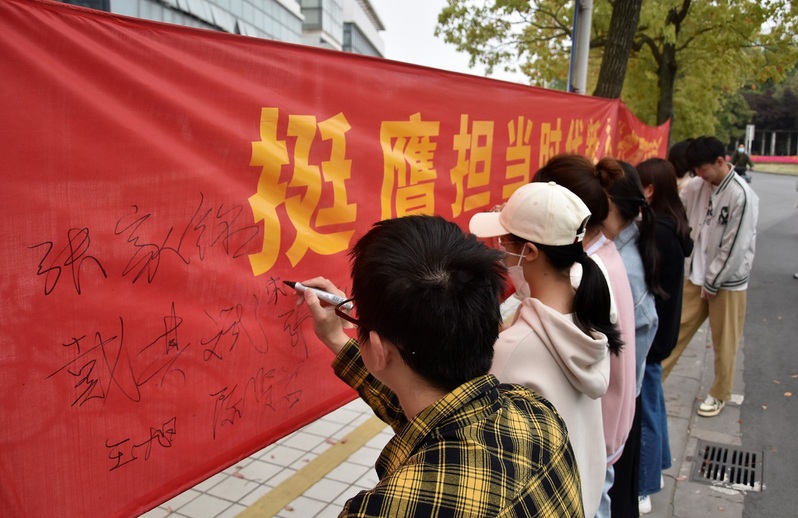 4月14日,学生工作处在啬园校区校园服务中心南侧举行“全民国家安全教育日”学生签名活动,学生们纷纷在印有“挺膺担当时代新人,共筑国家安全防线”的宣传横幅上签名。
