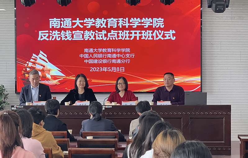 5月8日下午,教育科学学院携手中国人民银行南通市中心支行、中国建设银行南通分行开展反洗钱宣教进校园活动,并举行反洗钱宣教试点班开班仪式。中国人民银行南通市中心支行副行长赵美华、中国建设银行南通分行合规官朱勤、学院党委书记朱丹出席开班仪式,院长沈永江主持开班仪式。