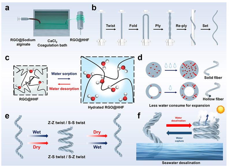 该研究通过湿法纺丝制备了一种中空石墨烯水凝胶纤维,再经过加捻、折叠、卷绕等工序得到一种智能型双螺旋纤维驱动器。该驱动器可以在光、水快速双重响应下实现动态自动伸长与收缩过程,这种动态可逆响应运动使其在可持续海水淡化和盐沉积处理中具有可靠的应用前景。