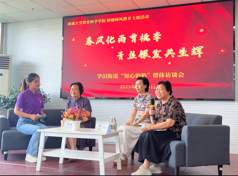访谈会以“春风化雨育桃李,青丝银发共生辉”为主题,旨在传承和弘扬老一辈教育工作者的优良师德师风。据悉,南通市学田街道“知心奶奶”群体是以退休老教师为主体的服务社区少年儿童的群众性志愿者服务组织,是全省首届最美老干部志愿服务团队,曾获得江苏省关心下一代先进集体等50多项荣誉称号,2022年“知心奶奶群体”党支部书记蔡松英获评“中国好人”荣誉称号。教育科学学院研究生党支部自2012年起在学田街道与“知心奶奶群体”联合创办“七彩周末课堂”志愿服务项目,十余年来累计开课500余堂,服务社区16000人次。