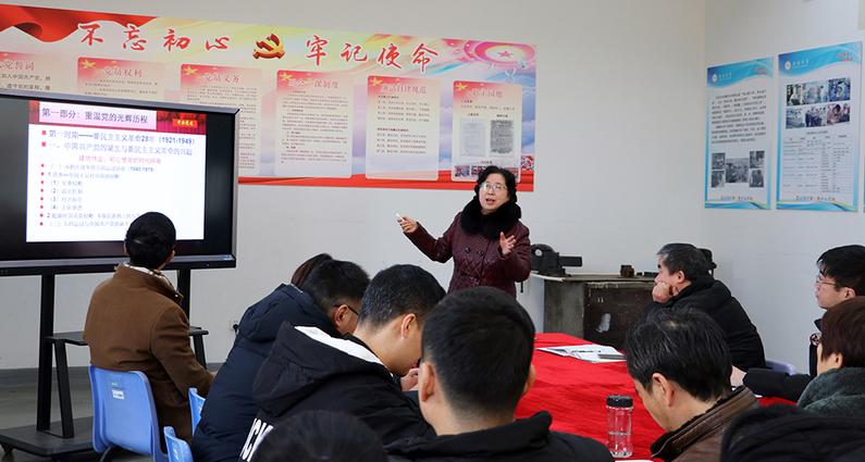 12月16日下午,工程训练中心党支部召开全体党员会议,邀请马克思主义学院蔡娟教授为支部党员作“四史”学习专题辅导报告。蔡娟教授以“重温党的历史,践行初心使命——以党史为主线主体叙述四史”为题,传达了习近平总书记关于“四史”学习教育的重要讲话,讲述了习近平总书记一次次踏访红色故土,追寻革命足迹的感人故事,带领大家详细回顾了从新民主主义革命28年、新中国成立后探索建设社会主义的29年、党的十一届三中全会改革开放到现在42年等三个时期中国共产党践行初心使命的光辉发展历程,向大家阐述了“四史”的逻辑关系,并提出“不忘初心、牢记使命”的实践要求。中心党支部书记陆伟家主持报告会,希望全体党员以报告中讲述的“四史”脉络为主线,进一步加强“四史”的学习,深入思考如何从“四史”中汲取智慧和奋进的力量,促进学习与工作能力的再提升。工程训练中心支部结合“四史”的学习教育,在中心“党员之家”布置工训发展简史系列展板,激励全体职工切实践行先校长“学必期于用,用必适于地”的办学思想,在本科人才培养中不忘初心,砥砺前行。(陈欣)工程训练中心党支部举行“四史”学习专题报告会。
