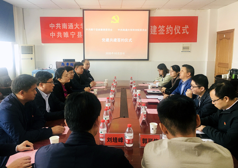 10月23日上午,药学院党委与睢宁县姚集镇党委举行共建签约仪式。学院党委书记徐建代表学院党委与睢宁县姚集镇党委书记卜青青共同签署党建共建框架协议。本次签署的党建共建项目旨在深入学习习近平新时代中国特色社会主义思想及重要讲话精神,全面推进党组织建设,搭建党建共建平台,形成“共建组织、共抓队伍、共享资源、共谋发展的党建工作新格局。根据共建协议,双方将定期召开座谈会、上党课,充分发挥结对双方党组织的自身优势,相互交流党员教育管理工作经验,提升党建工作整体水平,邀请党员参与对方单位党建活动,进一步发挥党员的先锋模范作用。会上,双方介绍了各自党委的基本情况,分享了党建工作中的积极经验和开展思路,围绕指导思想、共建目的、共建内容等方面进行了深入的交流。徐建希望以此次共建为契机,深入互相学习、分享工作资源、交流各自经验,进一步激发党员干部、师生员工的活力,以全方位、系列化的互动,促进党建共建活动开展。希望在党建工作的引领下,更好地将党建互促互进的政治优势转化为服务社会经济发展、服务广大师生群众的实际行动。学院全体党委委员、支部书记参加签约仪式。(童丽娟)药学院党委与睢宁县姚集镇党委举行共建签约仪式。