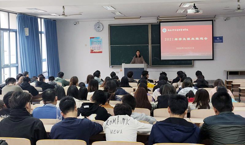 10月21日下午,经济与管理学院举办2021届毕业生就业推进会。学院党委副书记、副院长葛慧敏出席活动。葛慧敏介绍了前期召开的毕业年级学生座谈会的有关情况,指出当前求职的毕业生普遍存在的主要问题,向毕业生们提出三点建议:一是要认清形势,树牢“先就业再择业”的正确观念。毕业生要将个人发展愿景与经济社会发展客观实际相结合,合理确定择业目标,尽快落实实习岗位,在实践历练中夯实专业技能;二是要调整心态,做到越是迷茫越向前。毕业生更加积极主动参加用人单位招聘活动,勇于在各类求职实践中不断积累经验、明晰方向;三是要合作互助,充分做好各项求职准备工作。与会毕业生代表带头在班级里组建就业互助小组,相互帮助完成模拟面试等训练任务,不断提高面试技巧和竞聘能力。学院大学生就业创业协会指导老师、2017级辅导员魏妍妍分别从求职材料准备、应聘活动、形象设计与商务礼仪等方面对毕业生进行了详细的求职应聘辅导。会上还进行了出国升学项目推荐。毕业生纷纷表示,本次活动极具及时性、针对性和实战性,切实帮助他们解决了许多就业方面的困惑与疑问,帮助他们进一步明确了就业形势、提升了求职技能、明晰了就业方向、增强了就业信心。学院大学