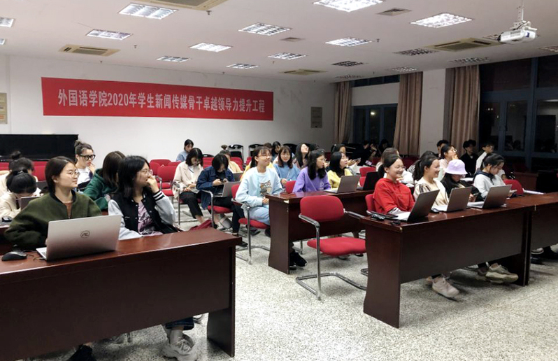 10月17日-20日,外国语学院举办2020年学生新闻传媒骨干培训班。本次培训分为“互联网思维与正确网络舆情观”“新闻通讯写作与摄影技巧”“Pr(PS)软件操作和影像录制与编辑”“微信公众号运营与推广”等专题。“互联网思维与正确网络舆情观”专题培训中,学院新媒体工作室指导老师夏光祥强调新闻宣传工作是展示学院办学成果和师生风采,塑造学院良好形象,提升学院品牌价值的重要途径,在对外宣传中应积极发出理性声音。培训期间,学院宣传骨干结合学院宣传工作实际,详细介绍了新闻通讯的特征、要素、类别、如何提高新闻采写能力以及新闻图片的拍摄要求和注意事项等,并对Pr、PS软件中的各项工具使用及具体实操进行深入讲解,对微信推文的规范形式、编写技巧以及如何增强推文吸引力等方面进行深入阐述。本次培训既包括理论知识,又涵盖实操性较强的校园新闻写作、新闻摄影、微信编辑等专题。同学们纷纷表示,培训不仅激发了大家对宣传工作的热情和兴趣,还提升了大家新闻写作、影像编辑、微信公众号运营等方面的技巧,他们将以此次培训作为新起点,不断提高自身的新闻素养和业务能力,助推学院新闻宣传工作再上新台阶。学院新媒体工作室全体成员、部分学