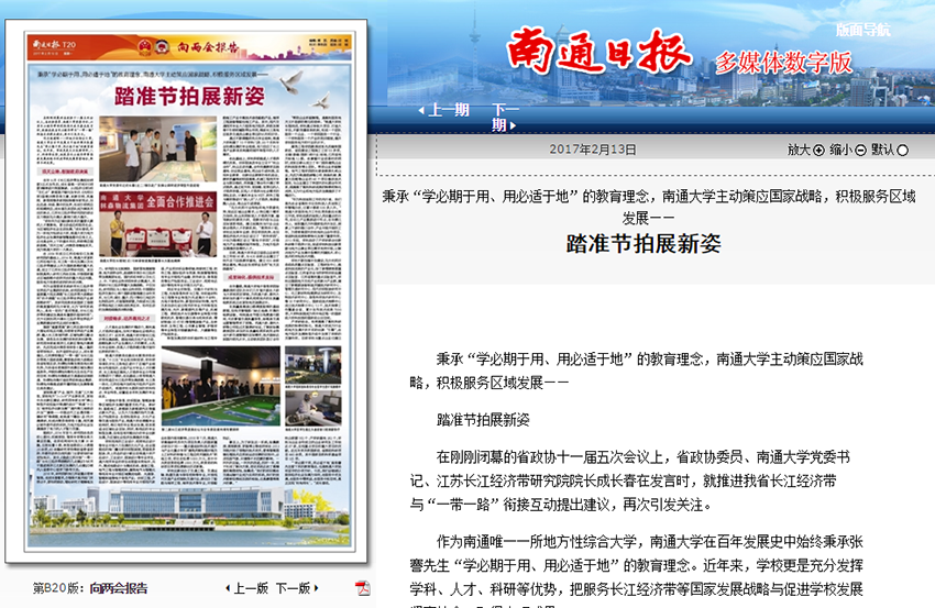 在南通市两会召开之际,2月13日出版的南通日报刊发题为《踏准节拍展新姿》的专版报道,详细介绍我校发挥